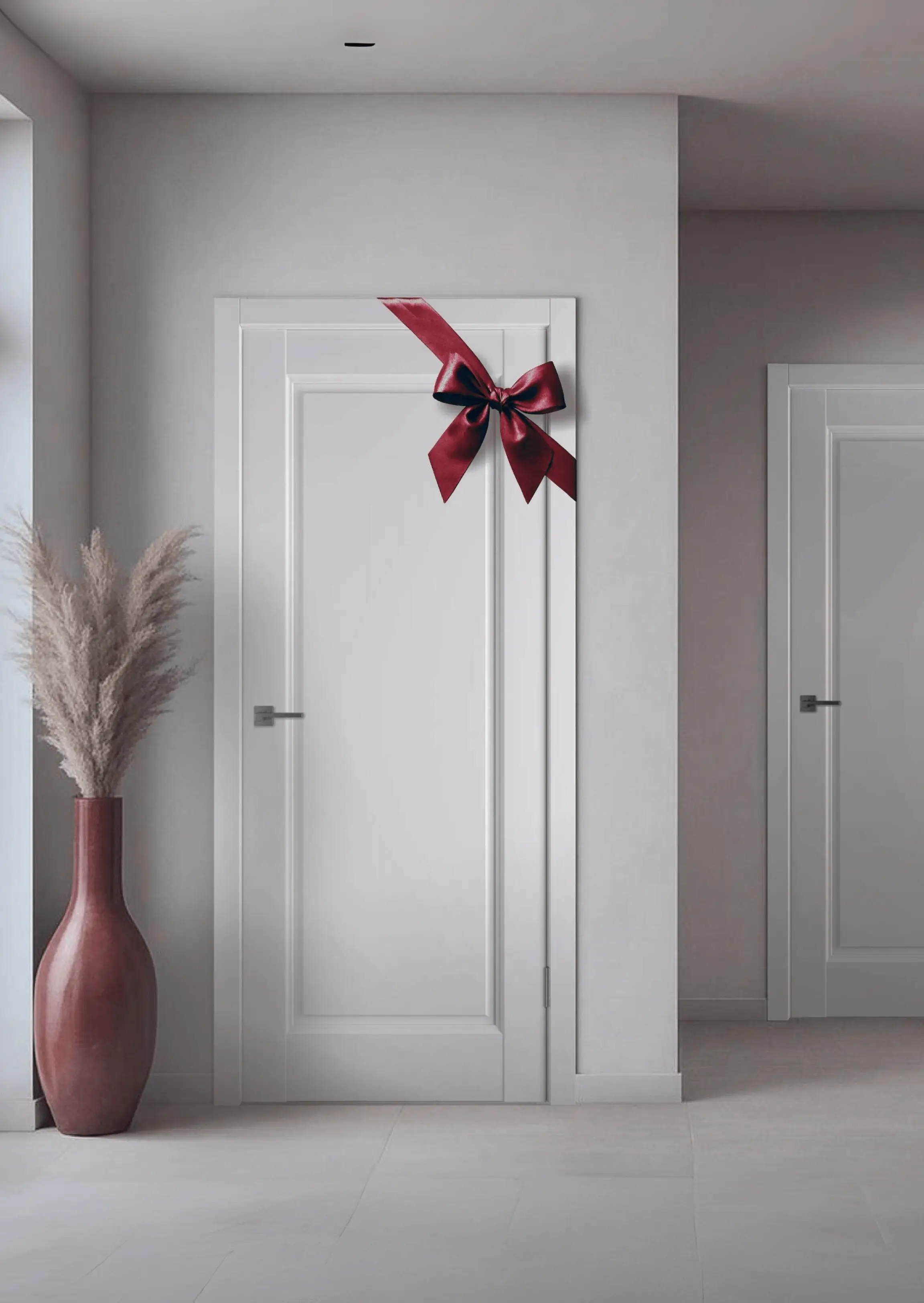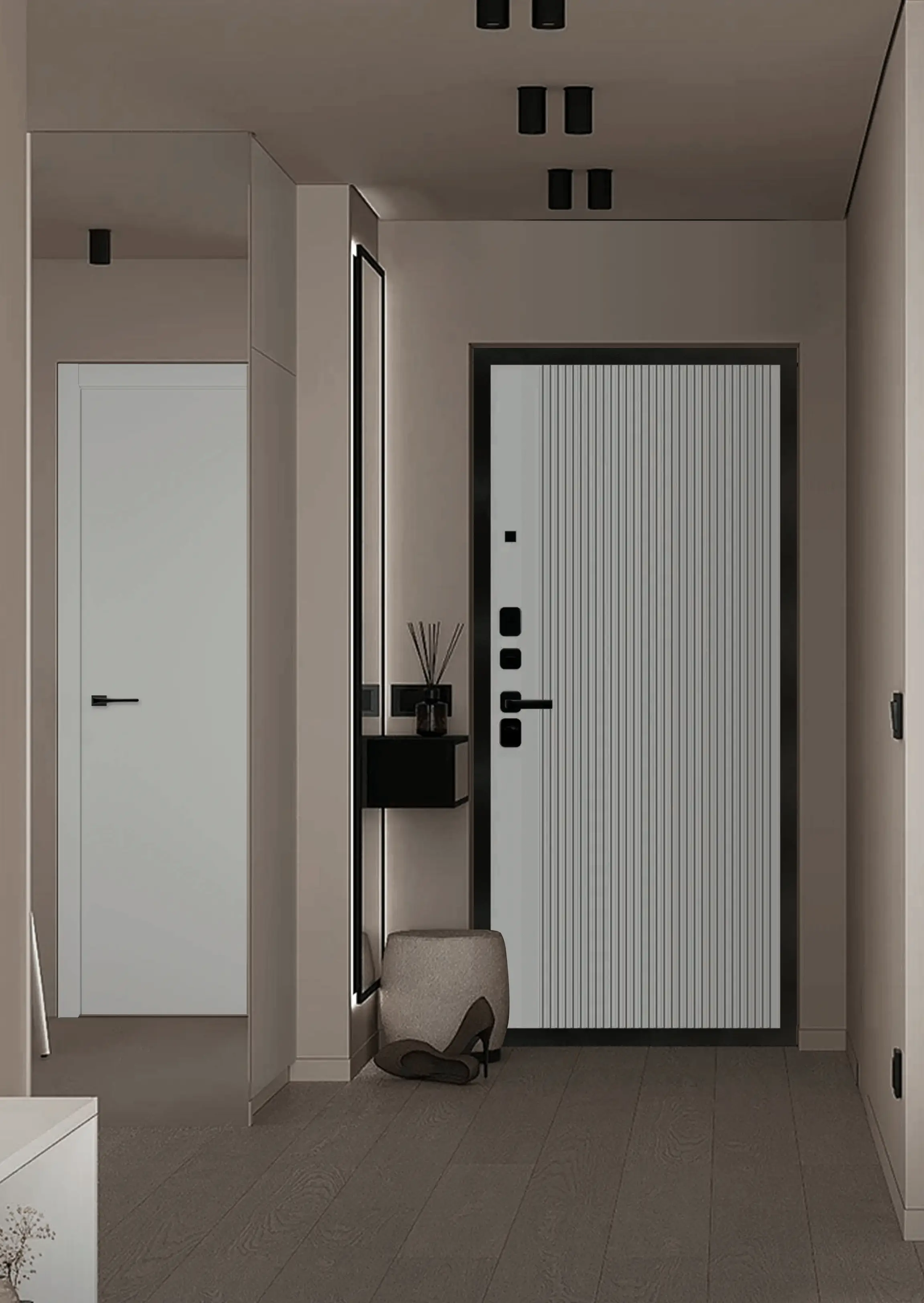 Дверь в таком интерьере — не акцент. Она не должна спорить со стенами, делить внимание с мебелью или звенеть яркими оттенками.
